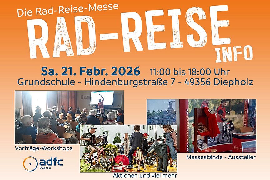 Am Sa. 21.02.2026 lädt der ADFC Diepholz zur RAD-REISE Info 2026 ein. Dann werden die Räume einer Grundschule in Diepholz zum Mekka vieler Radfahrenden weit über die Grenzen des Landkreises hinaus.